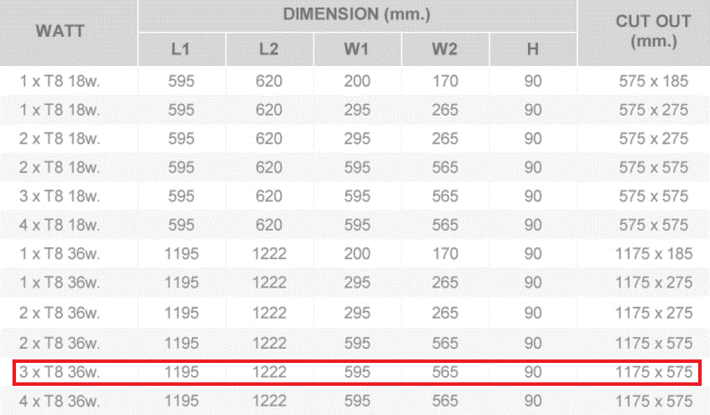 ขนาดโคมตะแกรงฝังฝ้า 3x36W (60x120cm.)
