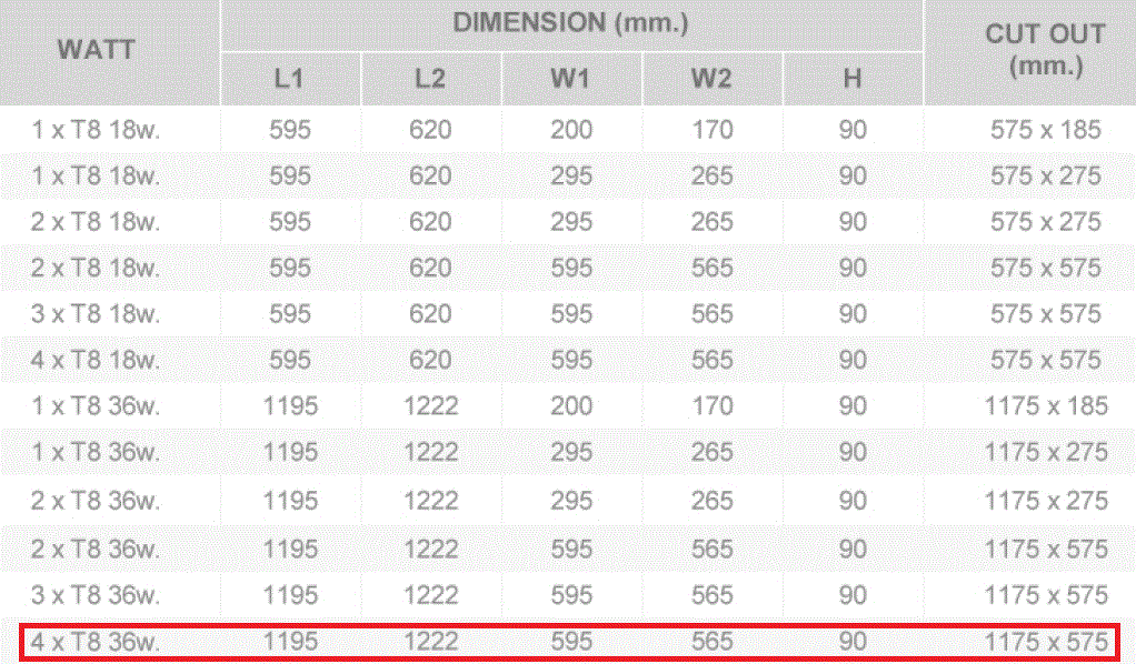 ขนาดโคมตะแกรงฝังฝ้า 4x36W (60x120cm.)