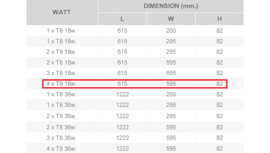 ขนาดโคมหน้าพลาสติกติดลอย 4x18W (60x60cm.)