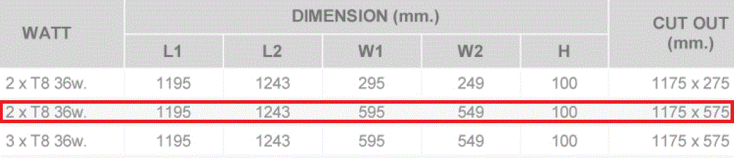 ขนาดโคมห้องคลีนรูม 2x36w (60x120cm.)